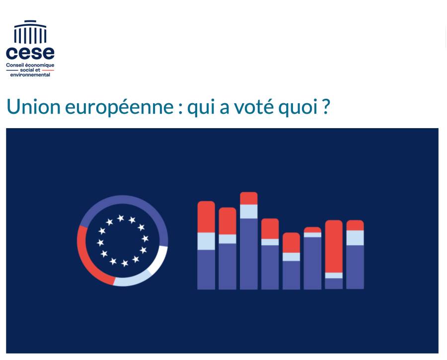 Lien vers l'actualité du CESE du 16 mai - cliquez ici - : présentation de Mapmymep.lecese. Cette plateforme inédite, créée par le CESE, agrège pour la première fois les 18 000 votes de la 9ème mandature du Parlement européen. Elle permet la visualisation et l’analyse instantanées des votes sur l’ensemble des textes de la mandature sortante, par groupe politique ou par pays.