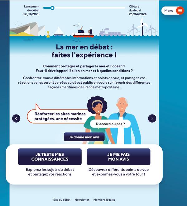 Parmi les moyens de participer, découvrez et partagez « La mer en débat : faites l'expérience », un outil grand public qui permet de s'informer et d'entrer facilement dans le débat : cliquez ici
